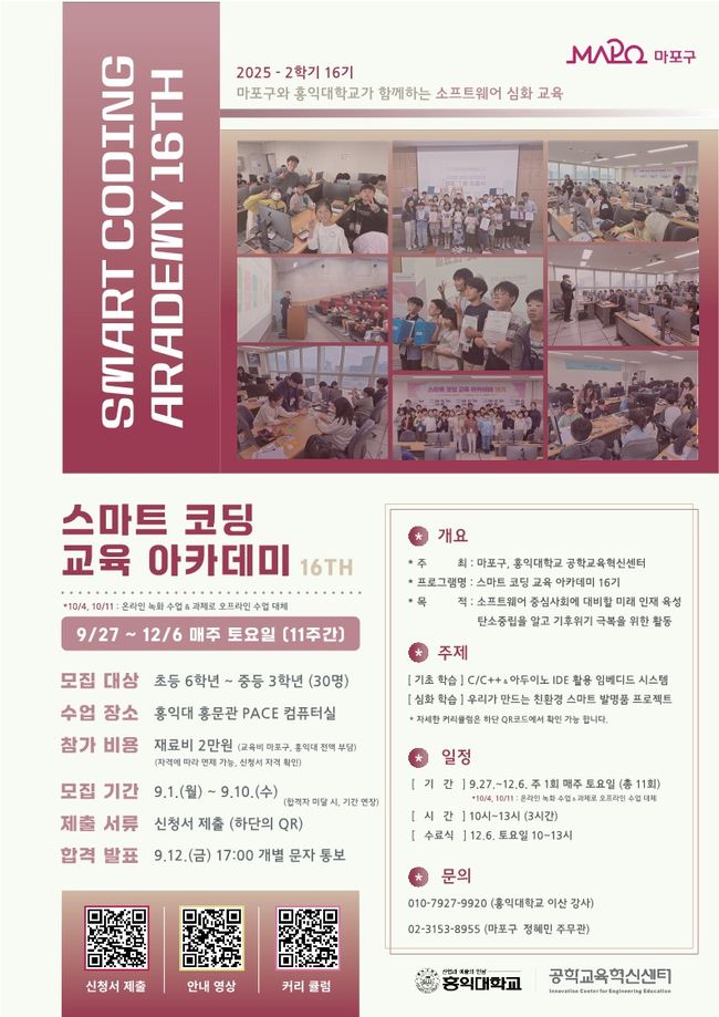 스마트 코딩 교육 아카데미 16기 포스터.마포구와 홍익대학교가 공동으로 운영하는 이번 아카데미는 9월 27일부터 12월 6일까지 초등학교 6학년부터 중학교 3학년 학생 30명을 대상으로 매주 토요일 오전 10시부터 오후 1시까지 홍익대학교 서울캠퍼스 홍문관 PACE 컴퓨터실에서 수업이 열린다. 교육비는 전액 무료이며, 교재와 일부 실습 재료비 2만 원만 학생이 부담하면 된다.
