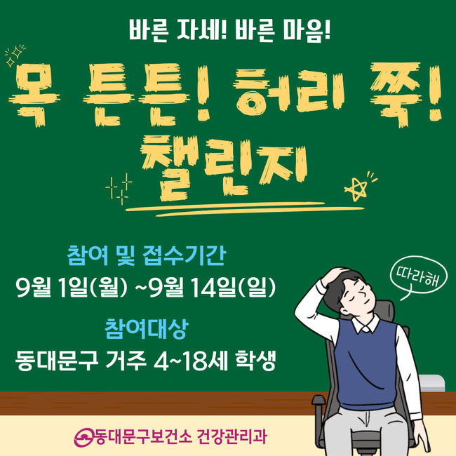 이번 챌린지는 관내 4~18세 아동·청소년을 대상으로 9월 1일부터 14일까지 2주간 진행된다. 참여자는 동대문구보건소가 개발한 ‘목 튼튼! 허리 쭉! 체조’를 따라 한 후, 인증사진을 카카오톡 채널 ‘동대문구 일상이 운동이 되다’ 내 ‘목 튼튼! 허리 쭉! 챌린지’ 메뉴에 업로드하면 된다.