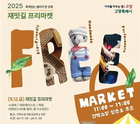 고양특례시(시장 이동환) 일산서구 대화동 53블럭(킨텍스 앞 장촌초등학교 후문 인근)에서는 오는 9월 12일(금), 10월 25(토) ∼26(일) 세 차례에 걸쳐 `재밋길 플리마켓`이 개최된다.