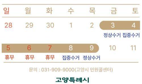 다만, 10월 5일(일), 6일(월·추석), 7일(화) 3일간은 휴무로 인해 수거가 이뤄지지 않는다. 이에 따라 쓰레기 배출은 반드시 수거일 전날 일몰 이후에 해야 한다.