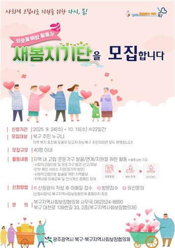 광주시 북구(구청장 문인)가 사회적으로 고립된 이웃들이 지역사회의 구성원으로서 돌아올 수 있도록 지원하는 `새봄지기단`에 참여할 주민을 오는 15일까지 모집한다고 9일 밝혔다.