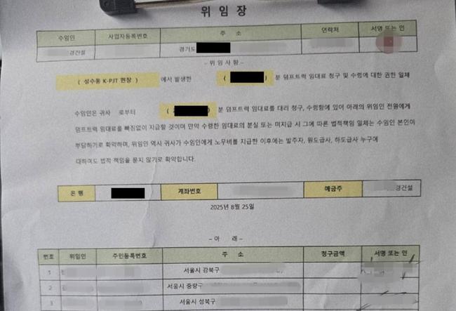 윤 의원이 공개한 자료에 따르면, 현장에서는 ‘건설기계임대차 계약서’ 대신 ‘전대 위임장’이라는 문서가 통용되고 있었다. 해당 위임장에는 기계 정보나 계약금액 등 필수 사항이 기재되지 않아 사실상 법적 효력이 없는 것으로 확인됐다.