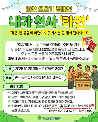 서울 강북구(구청장 이순희)는 관내 사회복지시설 꿈의숲종합사회복지관이 오는 10월 20일(월)부터 11월 7일(금)까지 3주간 라면모으기 캠페인 `내가 천사 라면`을 전개한다고 밝혔다.