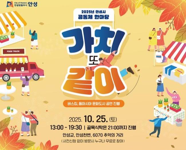 안성시(시장 김보라)는 오는 2025년 10월 25일(토), 안성시내 일원(안성교∼안성천변∼안성천∼6070 추억의거리)에서 2025 안성시 공동체 한마당 `가치 또 같이`를 개최한다.
