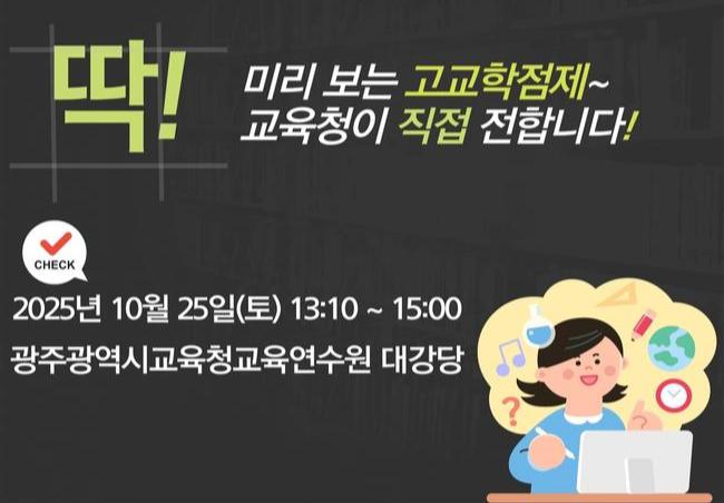 광주시교육청(교육감 이정선)은 오는 25일 오후 1시 광주시교육청교육연수원 대강당에서 중학교 3학년 학생 학부모를 대상으로 `고교학점제 설명회`를 개최한다.