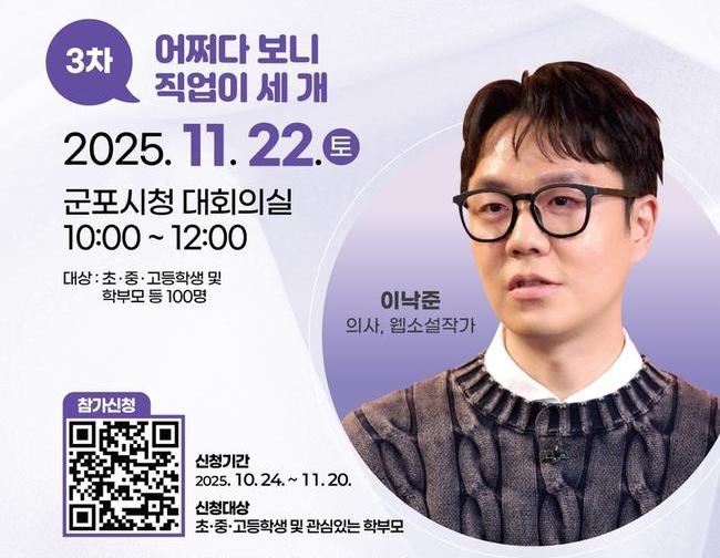 군포시(시장 하은호)는 청소년들이 자신의 꿈을 찾고 다양한 진로를 탐색할 수 있는 기회를 제공하고자 오는 11월 22일(토) 오전 10시 군포시청 대회의실에서 `청소년 꿈 멘토와 함께하는 토크콘서트(3차)`를 개최한다.