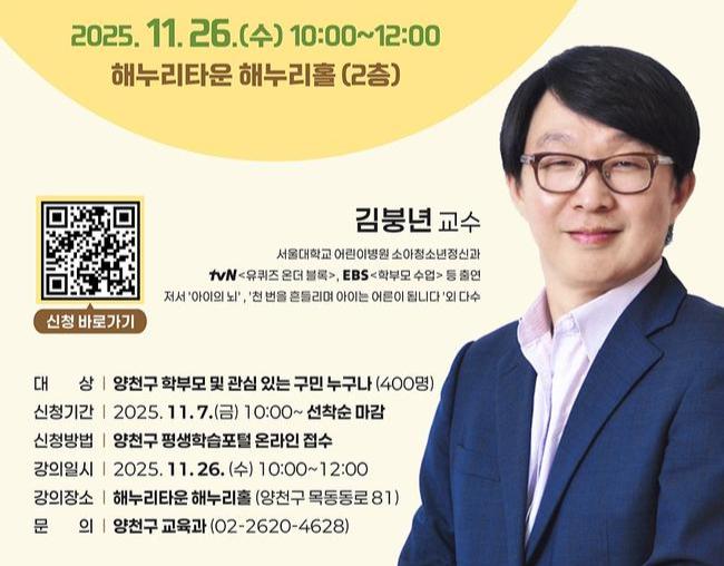 이기재 양천구청장은 "이번 특강을 통해 사춘기 자녀 양육에 고민이 많은 학부모들이 현실적인 해법과 따뜻한 위로를 얻는 시간이 되길 바란다"며 "앞으로도 자녀를 건강하고 주체적으로 성장시킬 수 있는 행복한 교육도시 양천을 만들어가겠다"고 밝혔다.