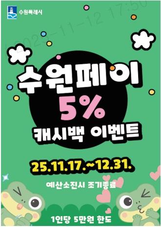 수원특례시는 17일부터 12월 31일까지 `수원페이 5% 캐시백 이벤트`를 연다. 수원페이 충전금으로 결제하면 5% 캐시백을 지급한다.