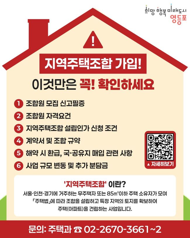 아울러 구는 지역주택조합 피해 예방을 위한 홍보도 강화하고 있다. 조합 가입 안내 리플릿을 동 주민센터에 비치하고 카드뉴스를 누리 소통망(SNS)에 게시해 주민에게 경각심을 높인다. 영등포구 홈페이지에서 ‘지역주택조합’을 검색하면 사업 현황, 절차, 피해 사례 등도 확인할 수 있다.