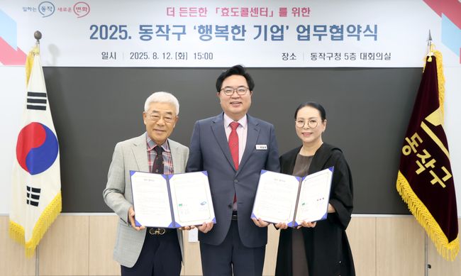 동작구는 지난 12일 구청 대회의실에서 효도콜센터 신규 후원기업인 사리원과 디이케이와 ‘행복한 기업’ 업무협약을 맺었다. 이번 협약을 통해 구는 취약계층 어르신 발굴과 연계, 후원 성과 홍보를 담당하고, 기업은 대상자에게 필요한 후원품과 서비스 지원을 맡는다.
