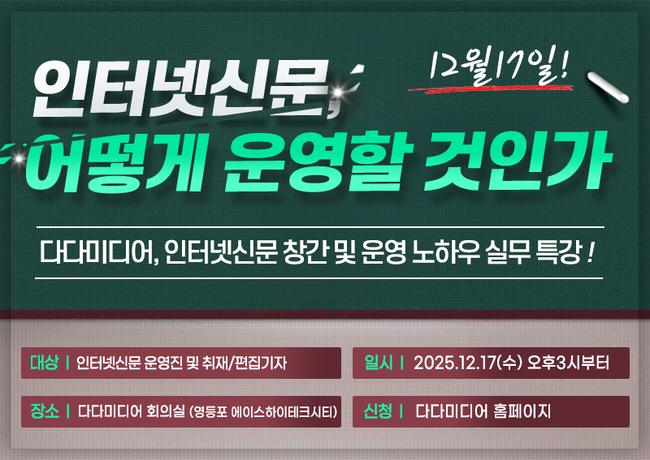 인터넷신문 솔루션 전문 다다미디어가 오는 12월 17일(수) 서울 본사 회의실에서 인터넷신문 창간 예정자와 운영자를 위한 실무 특강 ‘인터넷신문, 어떻게 운영할 것인가’를 개최한다.