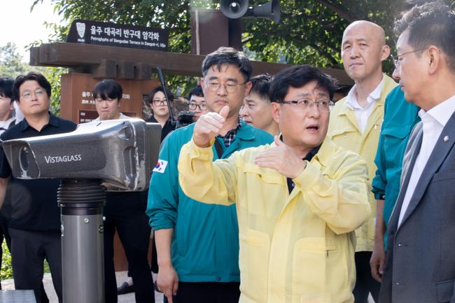 김성환 환경부 장관이 26일 울산광역시 울주군 소재 세계문화유산인 반구대 암각화를 찾아 반복적 침수 문제를 해결하기 위한 사연댐 수문 설치 방안 등을 논의하고 있다.